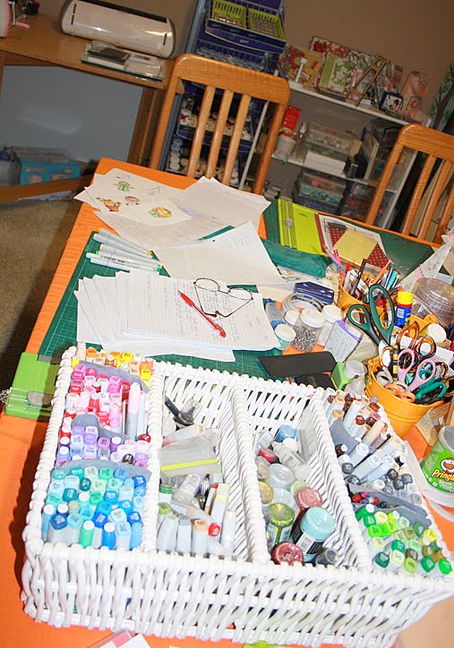 Here is the view to the right of my work area. That beautiful piece of green paper is for the little Hannah's and the rest of the pyramid of papers are the leftovers from Convention.
